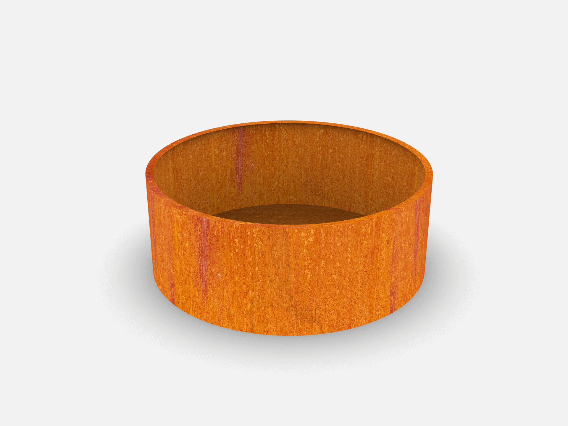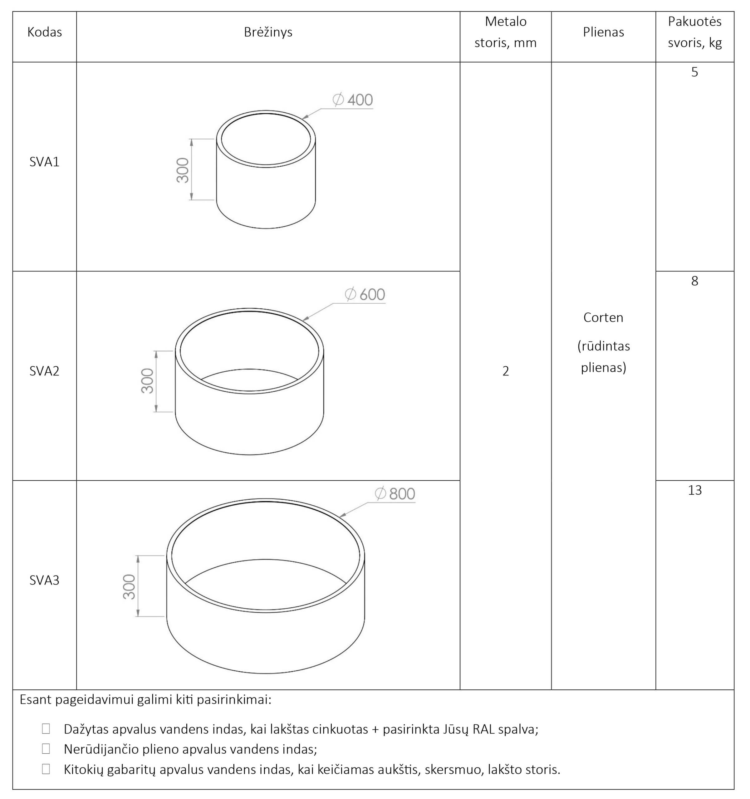 Apvalūs vandens indai iš 2 mm Corten plieno įrėmina vandenį. Tokia forma pabrėžia atspindžius ir iškart sutvarko kompoziciją. Uždėkite ant žvyro arba ant plokštės ir pripilkite vandens. Gaunate ramią horizontalią detalę be įrangos ir be sudėtingų sprendimų. Natūrali patina formuojasi lauke. Ji saugo metalą nuo oro poveikio ir suteikia šiltą spalvą. Tonas dera su akmeniu medžiu ir betonu. Vandens indai puikiai tinka terasai stogo sodui ir reprezentacinei zonai. Patogu kurti kompozicijas po vieną arba grupėmis. Siūlomi trys skersmenys 400 mm 600 mm ir 800 mm. Priežiūra paprasta, kartą per laiką pakeiskite vandenį ir nuvalykite dugną. Norint daugiau nuotaikos įleiskite vandens augalų. Pasirinkite dydį ir sukurkite ilgalaikį akcentą sodo kompozicijai.