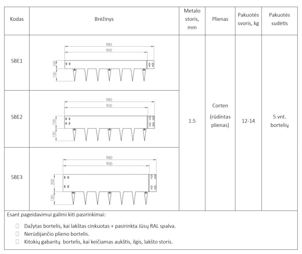 Greitos jungtys – auselė ↔ išpjova – leidžia bortelius sukabinti tvirtai ir estetiškai, be matomų varžtų. Integruoti smaigai lengvai susminga į gruntą. Lakštas 1,5 mm storio leidžia formuoti tiek tiesias linijas, tiek švelnius lankus. Galimi trys aukščiai (100 / 150 / 200 mm), todėl bortelį priderinsite vejos, takų, gėlynų ar terasos zonoms.