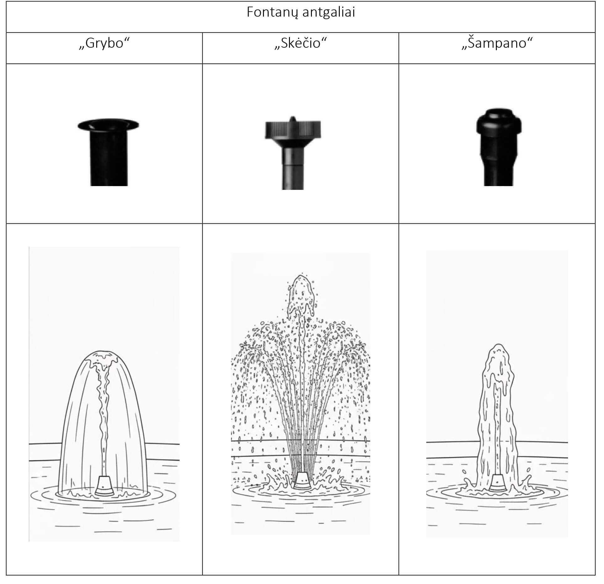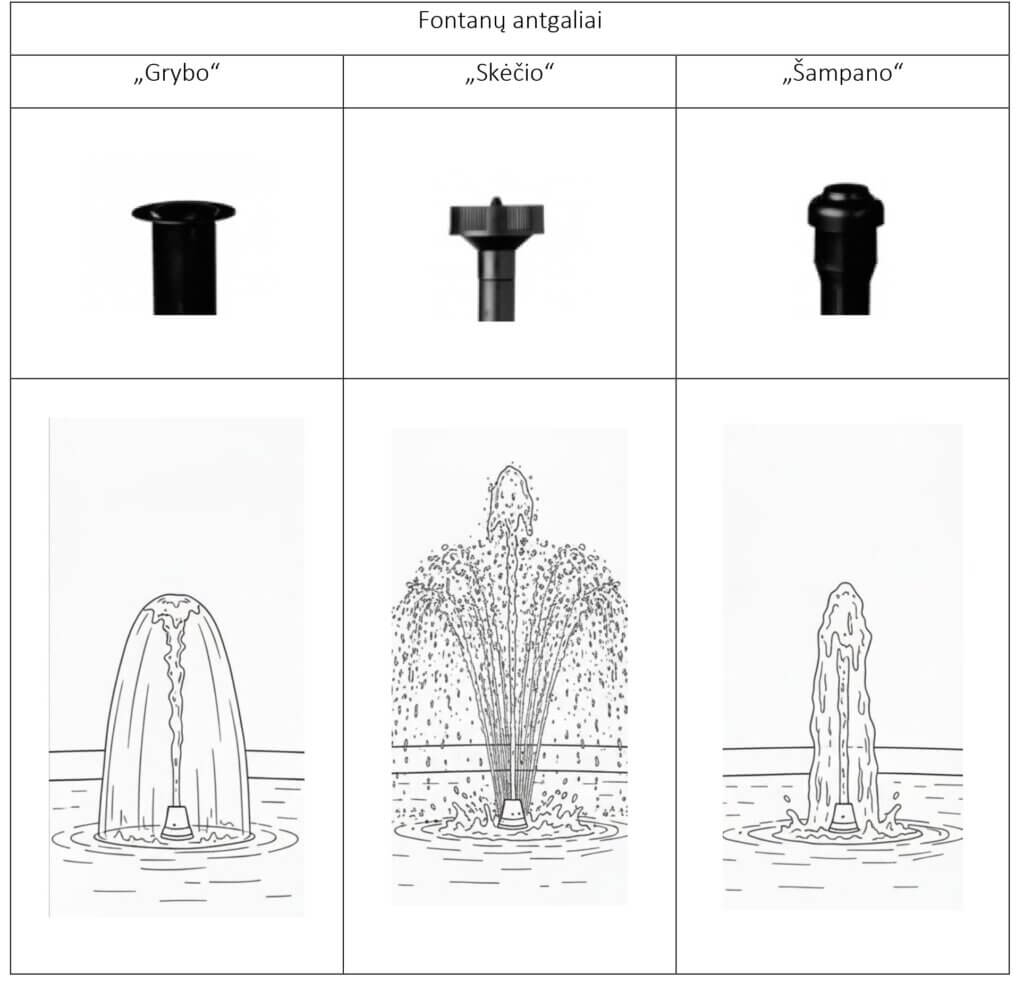 • 3 vnt. fontano antgaliai „Šampanas”, „Lietutis” arba „Grybas”.