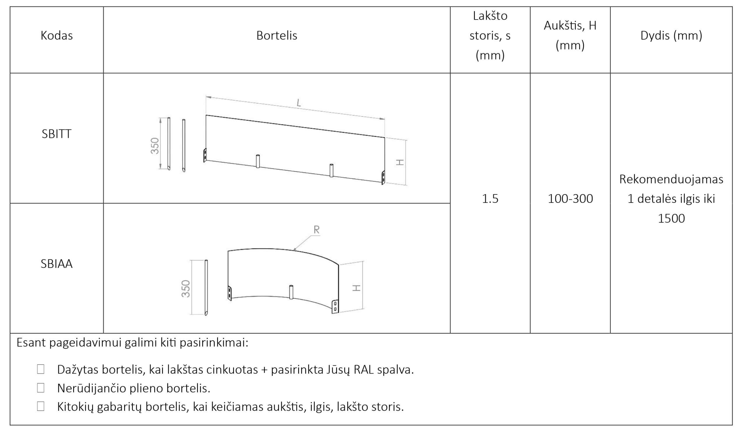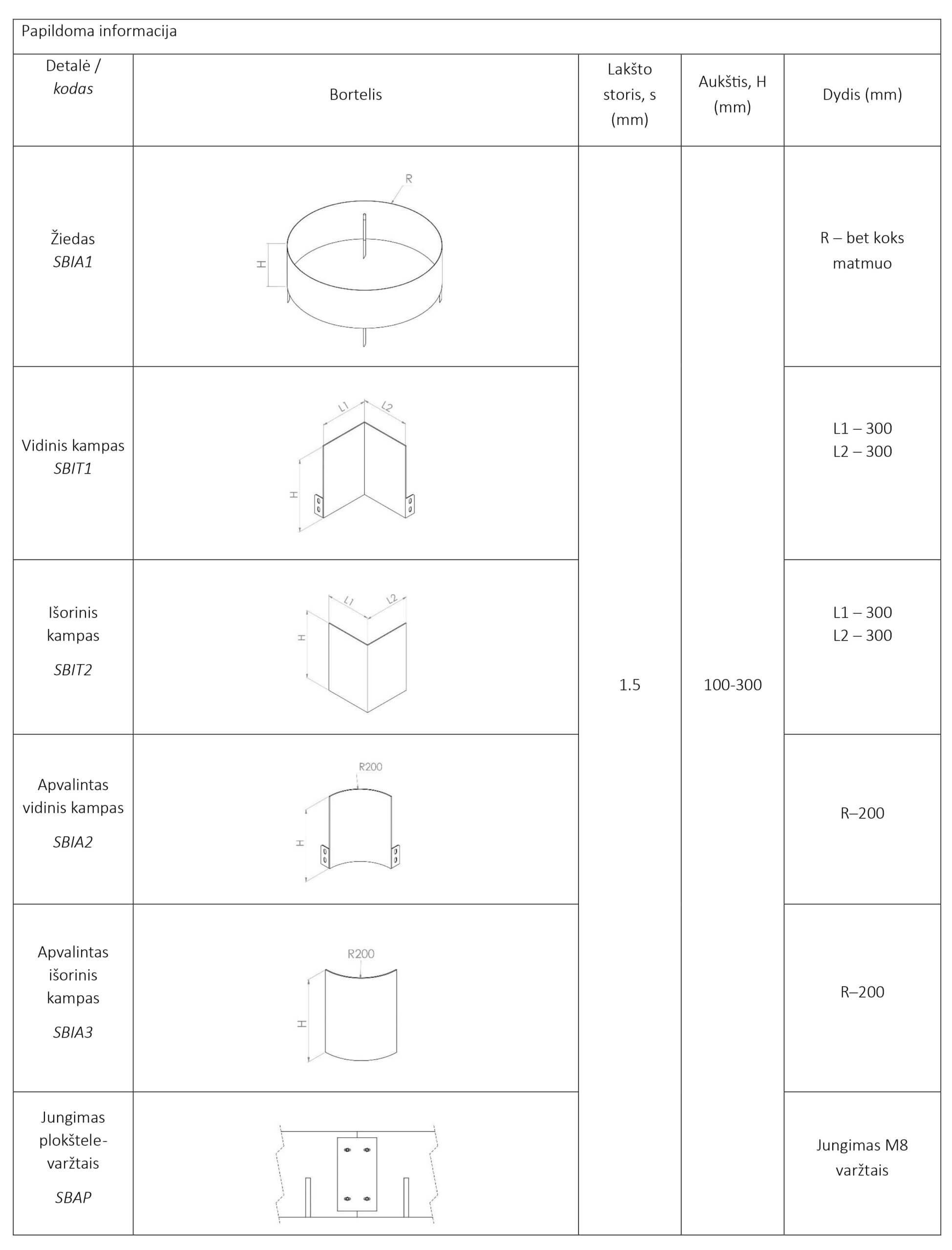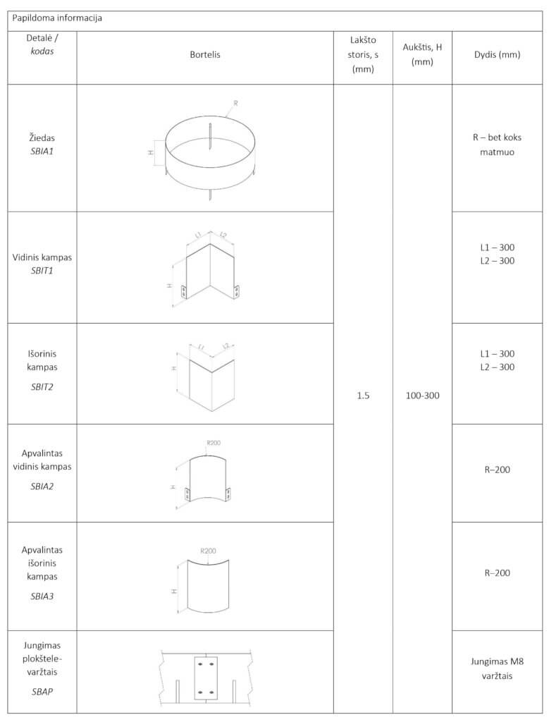 Borteliai varžtais sujungiami per šonines plokšteles. Prie bortelio privirinti apvalūs vamzdeliai skirti smeigėms, kurios stabilizuoja konstrukciją grunte.