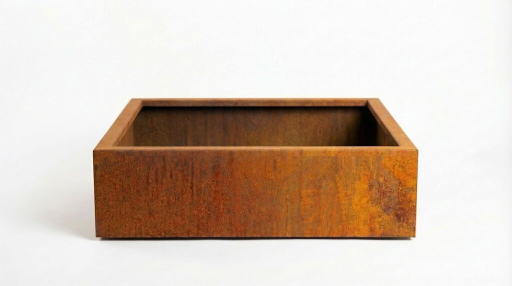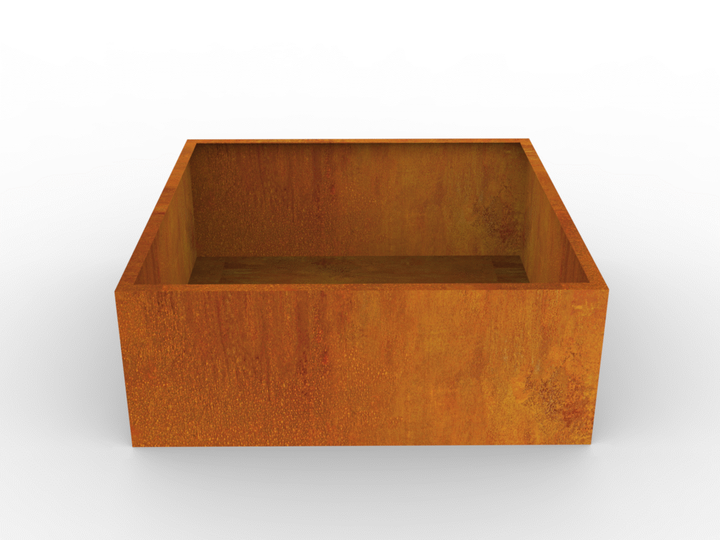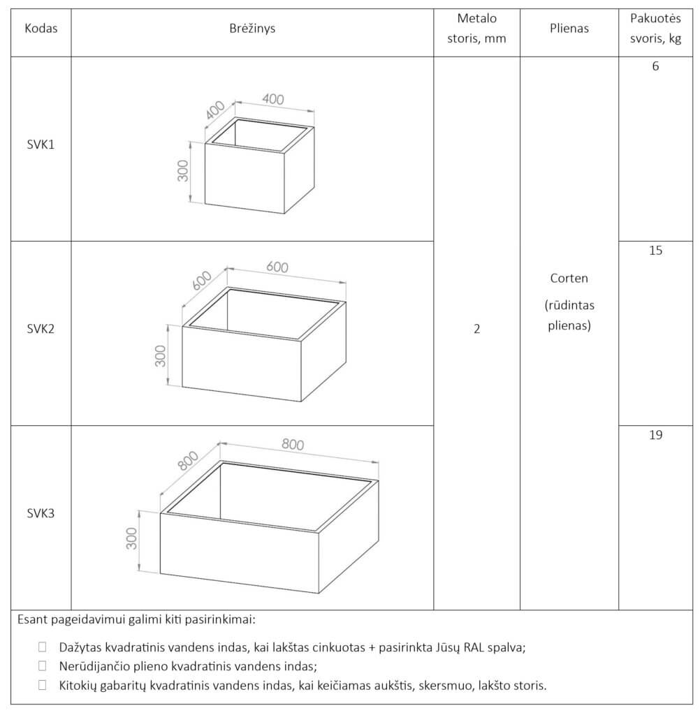 Kvadratiniai vandens indai iš 2 mm Corten plieno išryškina architektūrinę liniją. Griežtas kontūras ramina ir sukuria skaidrų vandens veidrodį. Indai veikia kaip rėmas kuris pabrėžia šviesos ir dangaus atspindžius. Pastatykite ant žvyro ar betoninės plokštės užpildykite vandeniu ir turėsite Išbaigtą akcentą be inžinerinių darbų. Viršutinė briauna patogi paukščiams nutūpti todėl indas tampa natūralia girdykla. Corten paviršius lauke įgauna patiną kuri saugo metalą nuo aplinkos ir suteikia šiltą rudos spalvos atspalvį. Kvadratinė forma leidžia kurti modulius iš kelių dydžių ir derinti su tiesiomis dangomis. Siūlomi trys matmenys 400 x 400, 600 x 600 ir 800 x 800 mm. Su šiuo produktu greitai atnaujinsite erdvę ir maža dalimi atkartos ežerą ar tvenkinį (tik indus galima perkelti).