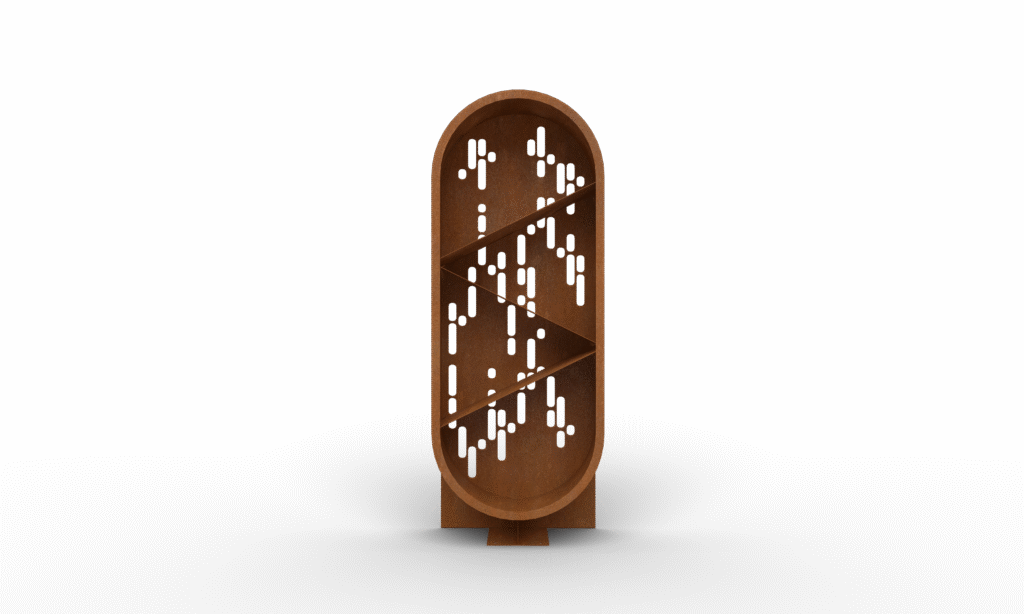 Tai dekoratyvi ir funkcionali malkinė malkų laikymui, rūšiavimui ir patogiam paėmimui. Ji veikia ir kaip kiemo dizaino elementas – „meno kūrinys“ iš Cor-ten® plieno ir malkų tekstūrų.