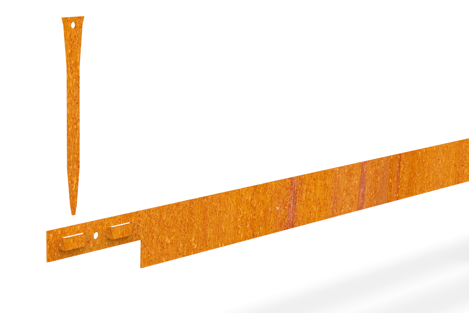 Corten plieno tako atskyrimo bortelis disciplinuoja kontūrą ir išlaiko tiesią, tvarkingą liniją. Corten plienas 3 mm storio suteikia standumą, todėl kraštas ne „pabėga“ ir linija išlieka tiesi per visą ilgį.