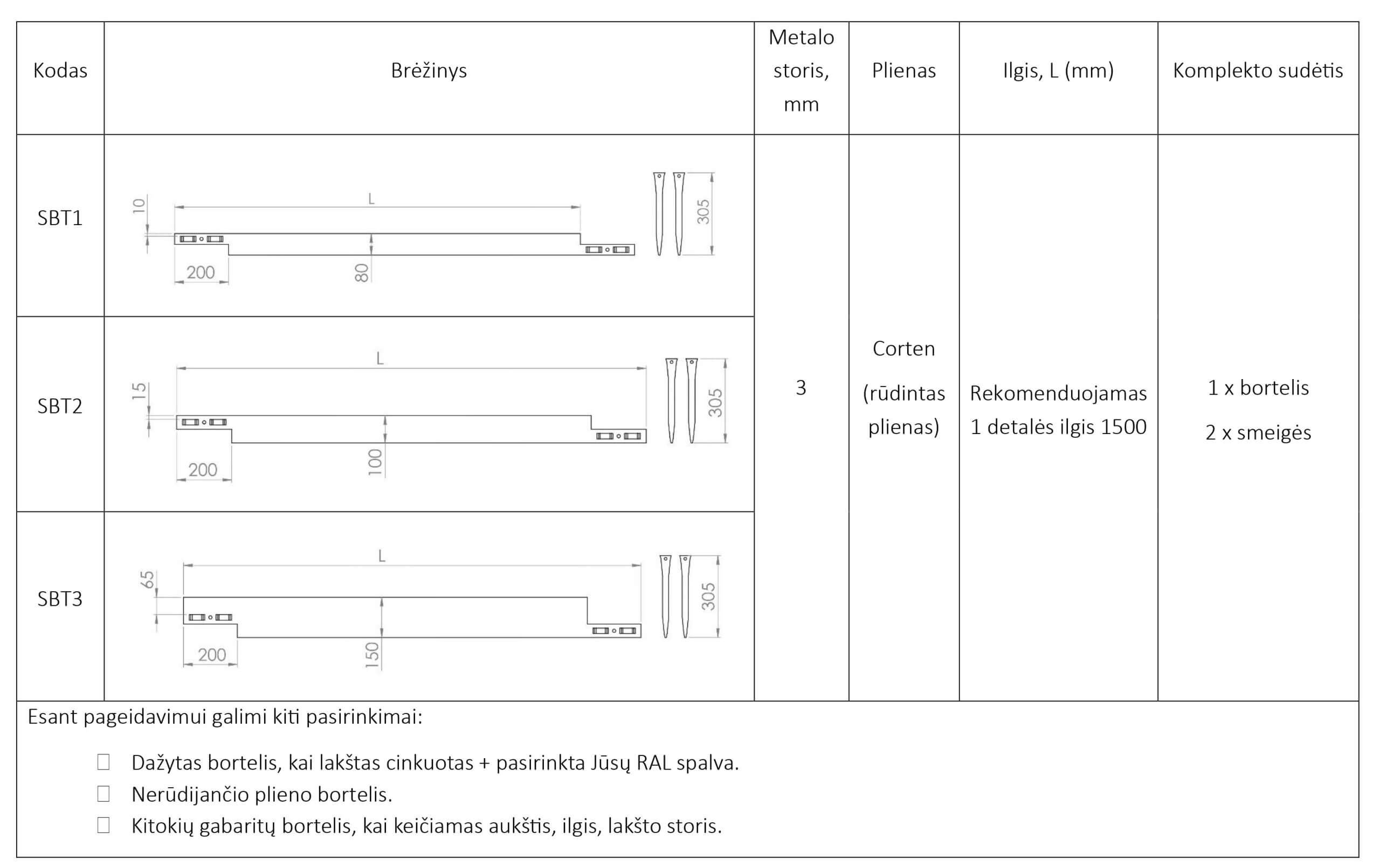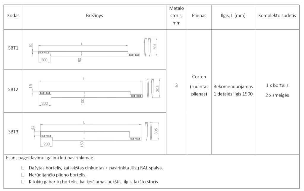 Galimi 80, 100 arba 150 mm aukščiai – pritaikysite tiek takams (žvyro, skaldos, trinkelių), tiek gėlynams ar terasų perimetrams. Standartinis vienos detalės ilgis 1500 mm, esant poreikiui galime pagaminti 3000 mm ilgio bortelį. Konstrukcija pakankamai lanksti švelniems vingiams, tačiau labai mažų spindulių formuoti nerekomenduojame.
