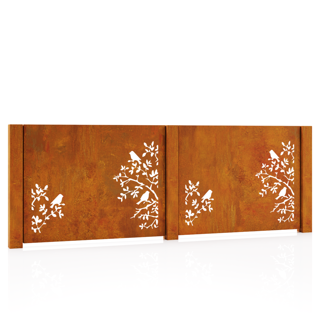 „Amelia“ – tai tvora iš rūdinto Corten plieno, puošta subtiliu šakelių ir paukštelių motyvu. Perforuotas raštas išdėstytas tik apatinėje dalyje, todėl vizualiai išlaikomas privatumas, o dekoras tampa jaukia, išskirtine detale.