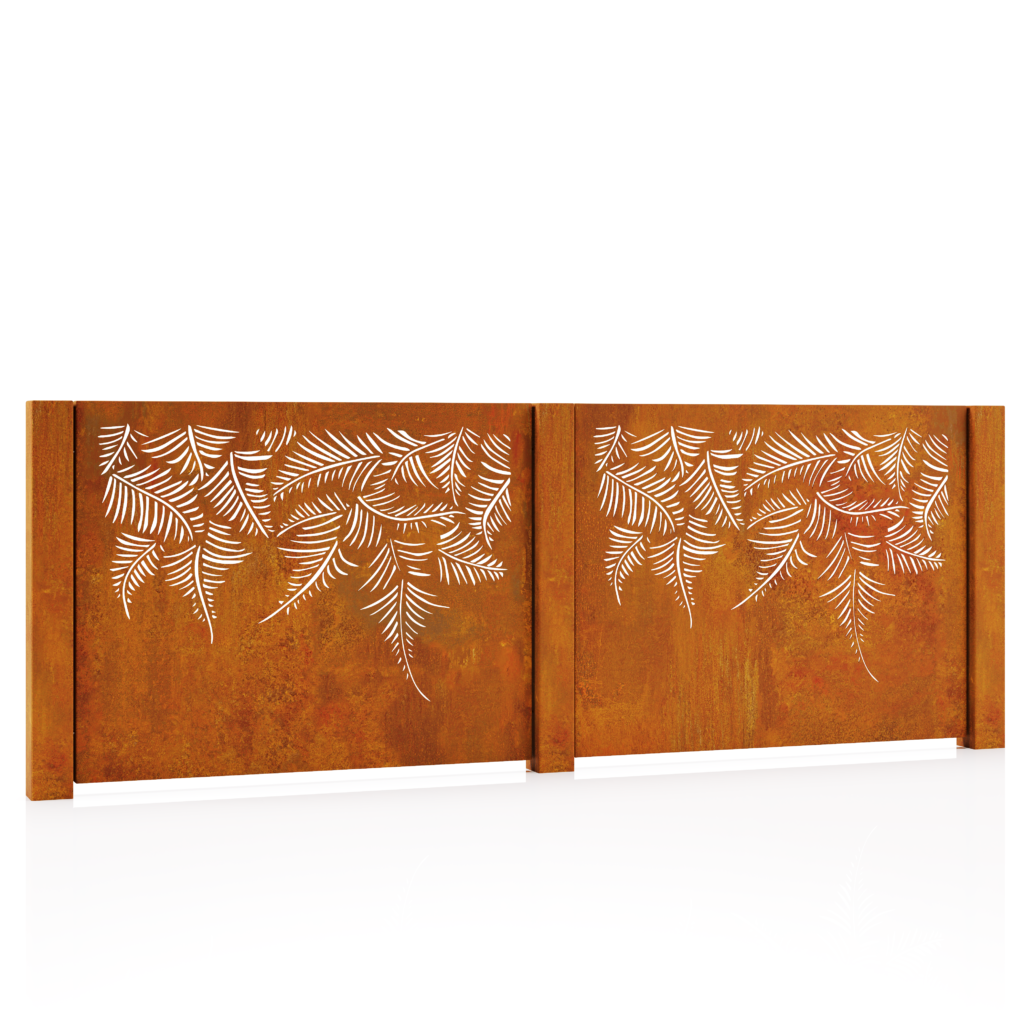 „Kadagys“ – tai Corten plieno tvora su perforuotu augaliniu raštu, kuris primena šakelių ir lapų siluetus. Šis dekoras ne tik pagyvina bendrą vaizdą, bet ir įneša natūralios estetikos, kuri puikiai dera tiek prie modernios architektūros, tiek prie gamtos apsuptos aplinkos.